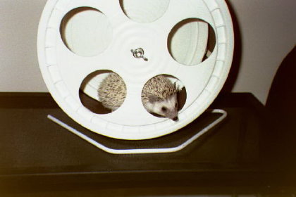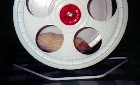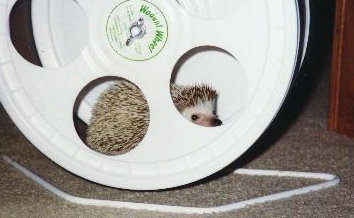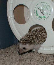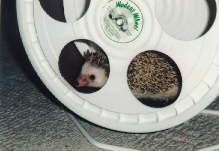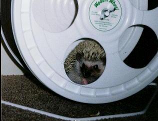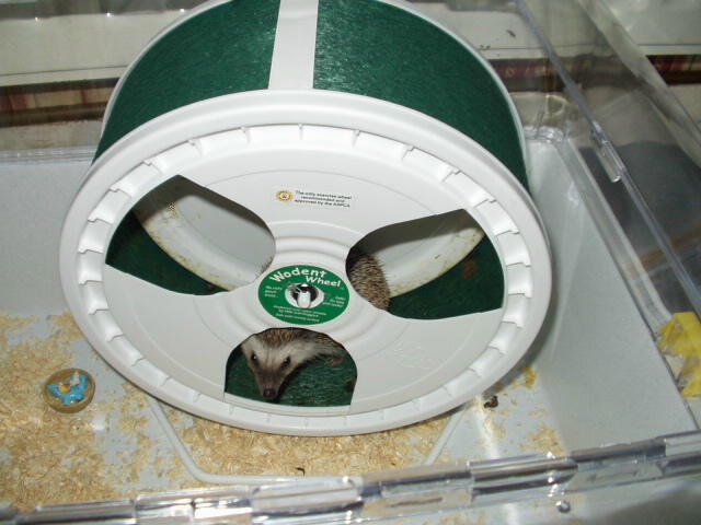 An anonymous British refugee hedgie enjoys a little wheel solace at